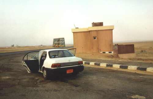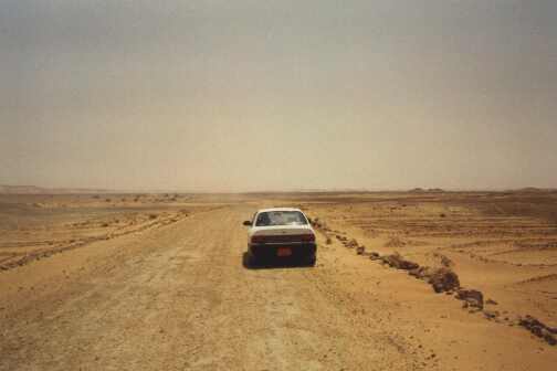 Während der Fahrt beginnt ein angeregtes „Hände-Füße-Deutsch-Englisch-Arabisch-Gespräch“. Der Typ ist wirklich super nett, wir versuchen uns über unsere Familien und ähnlichen Quatsch zu unterhalten. Der Typ meint, Frauen sollten zu hause bleiben und nicht arbeiten und er versucht uns klar zu machen, das er Hitler total toll findet. Mit vorgehaltener Waffe zwingt er Jochen, eine seiner ekelhaften Ägyptischen Kleopatra-Zigaretten zu rauchen. Wir geraten in einen heftigen Sandsturm. Das ist wie bei Nebel mit unter 50m Sichtweite. Man sieht die Wüste nicht mehr und man sieht die Straße nicht mehr. Vor allem sieht man die Schlaglöcher in der Straße nicht mehr...