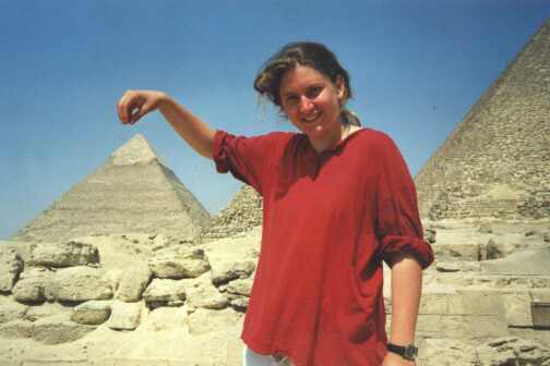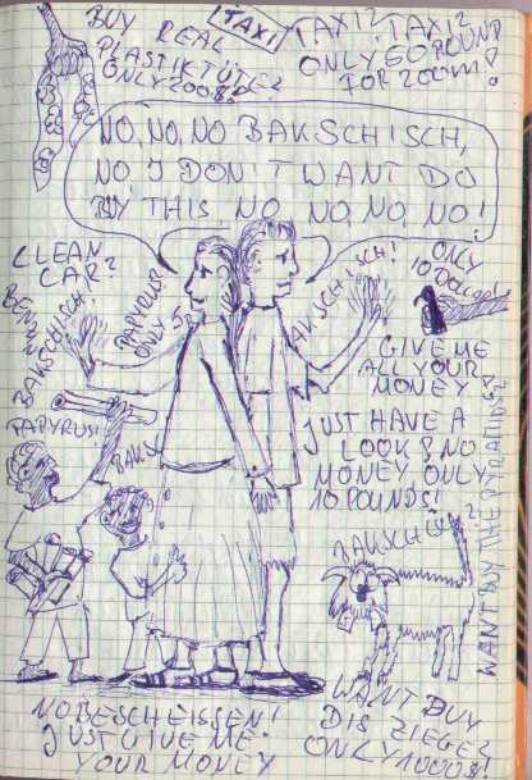 Was für ein Tag. Nach dieser schrecklichen Nacht an der Autobahn fahren wir nach Kairo, Pyramiden gucken. Dort angekommen wollen alle nur das eine: „Geld, Geld, Geld“ ! „Bakschisch?“ Sie ziehen uns den letzten Pfennig aus der Tasche – Geld hier, Geld da. Wir besichtigen die Pyramiden, machen unfreiwillig eine Führung mit, landen in einer Papyrusfabrik (wir Deppen!). Millionen von Kindern laufen uns hinterher, wir haben unsere Hüte im Auto vergessen, schwitzen, können nicht mehr laufen. Ein Araber auf einem Kamel verfolgt uns und will fotografiert werden: „Madam, Madam, just one picture of me and the camel infront of the pyramids..“ und stellt sich in Pose. Alle wollen irgendwas. Olaf jammert leise vor sich hin, auf zur großen Cheops-Pyramide. Unerträglich Hitze. Ich bekomme einen