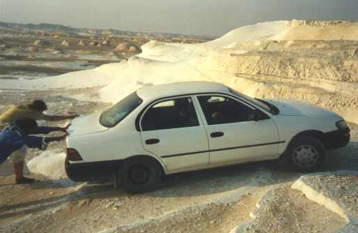 In der Mitte der Gärten ein Reisfeld. Es ist heiß hier, viel heißer als im Sinai. Nach einem letzten Teechen bei Badri zuhause brechen wir auf. Bis kurz vor Dakhla ist die Fahrt relativ langweilig. Ich fahre. Plötzlich muß ich anhalten – eine riesige Sanddüne hat sich auf die Straße geschoben. Da, wo mal die Straße war nur noch tiefer, weicher Sand. Ha, da lachen wir doch drüber – schließlich sind wird schonmal Offroad gefahren mit der Karre.“ Los Barbara, gib Gas!“ Ich, etwas unsicher: „ist das denn auch der richtige Weg – kann man das Teil nicht vielleicht umfahren??“ – „Ach was – kein Problem – gib Gas !“ – Ich fahre hundert Meter zurück und gebe Vollgas. Die 60PS der Reisschüssel tun, was sie können aber nach einigen Metern im Sand kommt was kommen musste – wir stecken fest ! Ha- kein Problem – kurz anschieben, dann geht das schon wieder. Wir schieben, buddeln, schieben, buddeln, schieben, buddeln – nichts passiert. Olaf und Jochen beschließen, unsere Luftmatratzen als Sandbleche zu benutzten – es dauert nicht lange, da hängen diese in großen Fetzen von den Reifen während sich das Auto keinen Zentimeter bewegt hat.