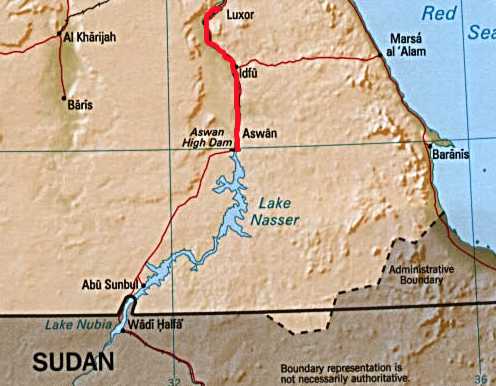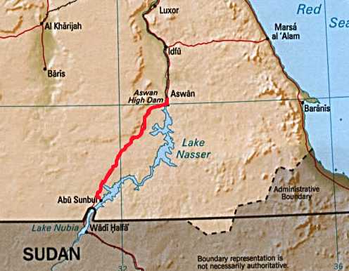Beiläufig finden wir dann den großen Staudamm, zahlen 6 Pfund Besichtigungsgebühr und müssen herzlich lachen. Wir kommen an einen Kontrollposten, der die Straße nach Abu Simbel versperrt. Dort macht man uns klar, das wir erst um 11h weiterfahren können, weil wir eine Eskorte brauchen. Um 11.30h erschein die Polizei und ein mit Maschinenpistole bewaffneter Araber in Zivil steigt zu uns ins Auto. Warum weiß keiner und aufgrund von Verständigungsschwierigkeiten kann uns das auch keiner erklären. Ich fühle mich unwohl – der Lauf der Maschinenpistole zeigt auf mich. Zum Glück legt der Typ die Waffe später etwas anders hin. Muß das??