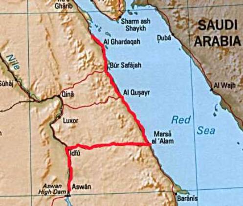Wir fahren den ganzen Tag Auto. Nach Hurghada. Eine total langweilige Fahrt durch eine unspektakuläre Landschaft. Hurghada: Hotelburgen mit Zaun drumrum und eine hässliche, kleine Stadt. Wir nehmen ein Budget Hotel abseits der Neckermann-Burgen. Im Klo schwimmt eine tote Kakerlake.