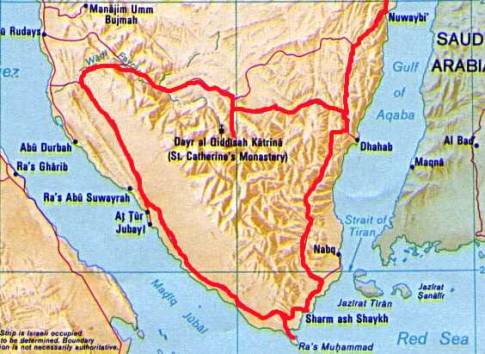 Am Kloster angekommen spendiert uns unser Mitfahrer dann fürs Mitnehmen erst mal einen Kaffee. Wir stellen fest, dass das Kloster nur bis zum Mittag geöffnet hat – Pech gehabt. Enttäuscht beschließen wir unsere Rundfahrt fortzusetzen und einen Abstecher zum Ras Mohammed-Nationalpark a.d. Südspitze des Sinais zu machen. Wir laden noch einen Polizisten ins Auto, setzen ihn nach einigen Kilometern ab und fahren weiter bis zur nächsten Kontrolle.